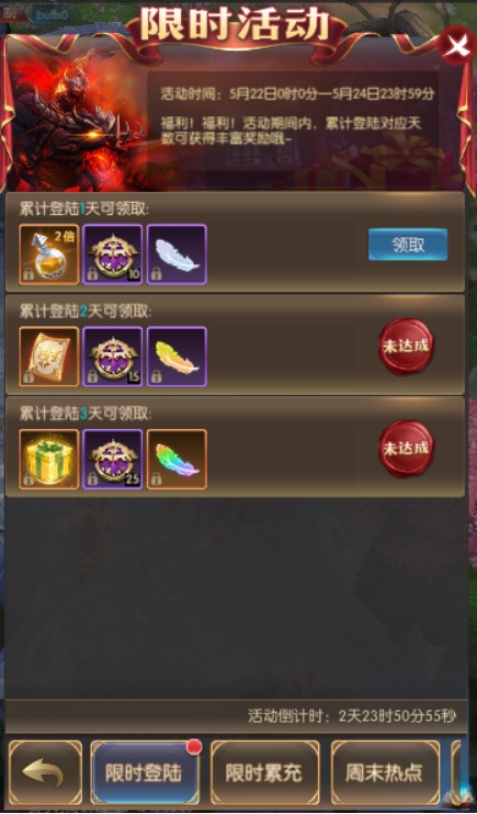 活动简介:福利!福利!活动期间内,累计登陆对应天数可获得丰富奖励哦~