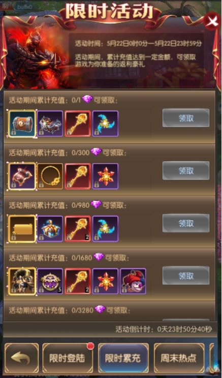 活动简介:活动期间,累计充值达到一定金额,可领取游戏为你准备的返利豪礼