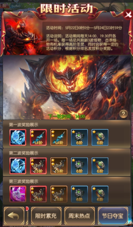 活动简介:活动期间每天14:00,19:30开各开一场。每一场总共刷新3波怪物,击杀怪物有获得高阶圣灵,同时会获得一定的活动积分,根据积分排名发放积分奖励。