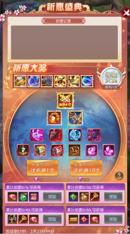 活动简介:活动期间可以消耗钻石购买金币进行祈愿,每次购买会赠送一个祈愿奖励 ;在奖池中抽到祈愿盛典大奖后,可在上方祈愿大奖奖池中抽取一次极品奖励(必然获得奖池中的极品奖励之一) ;祈愿达到累计次数可以获得对应的次数奖励,奖励多多 ;活动期间祈愿累计次数不会重置,活动结束后重置