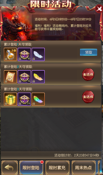 活动简介:福利!福利!活动期间内,累计登陆对应天数可获得丰富奖励哦~