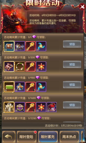 活动简介:活动期间,累计充值达到一定金额,可领取游戏为你准备的返利豪礼