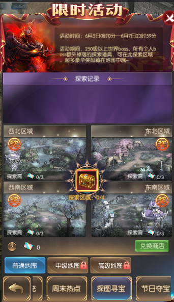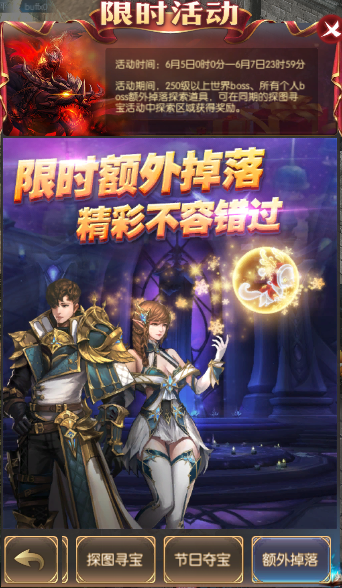 活动简介:活动期间,250级以上世界boss、所有个人boss额外掉落探索道具,可在同期的探图寻宝活动中探索区域获得奖励。