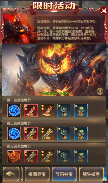 活动简介:活动期间每天14:00,19:30开各开一场。每一场总共刷新3波怪物,击杀怪物有获得高阶圣灵,同时会获得一定的活动积分,根据积分排名发放积分奖励。