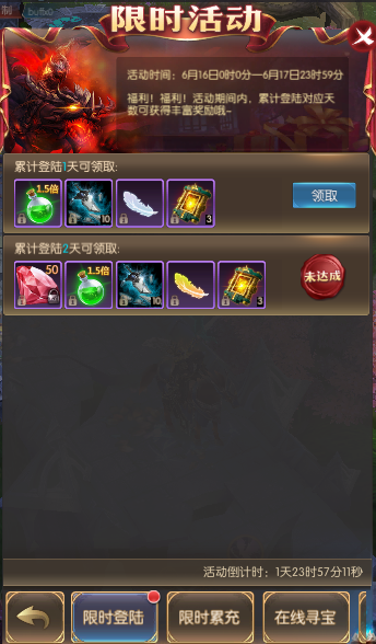 活动简介:福利!福利!活动期间内,累计登陆对应天数可获得丰富奖励哦~