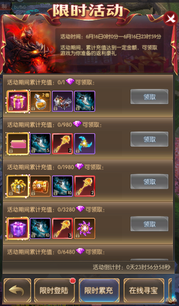 活动简介:活动期间,累计充值达到一定金额,可领取游戏为你准备的返利豪礼