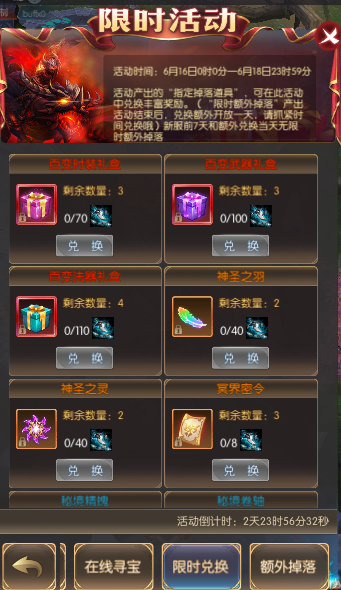 活动简介:活动期间,击杀250级以上世界boss、所有个人boss、冥界禁域、boss之家可额外掉落指定兑换道具,可在“限时兑换”活动中兑换丰富奖励;180级以上玩家野外挂机可额外掉落指定兑换道具,可在“限时兑换”活动中兑换丰富奖励
