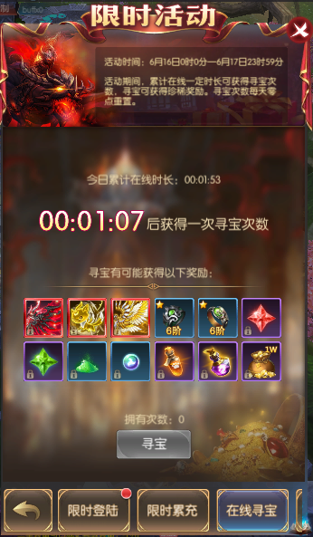 活动简介:活动期间,累计在线一定时常可获得寻宝次数,寻宝可获得珍稀奖励。寻宝次数每天零点重置。