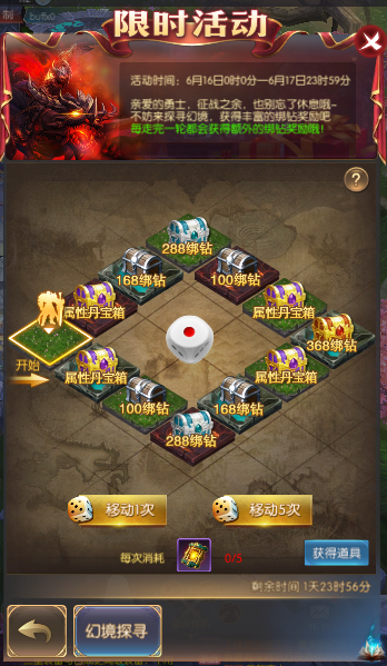 3.投骰子需要消耗幻境探寻道具。幻境探寻道具会通过钻石商城购买、累充和限时兑换获得。