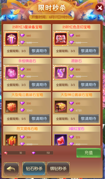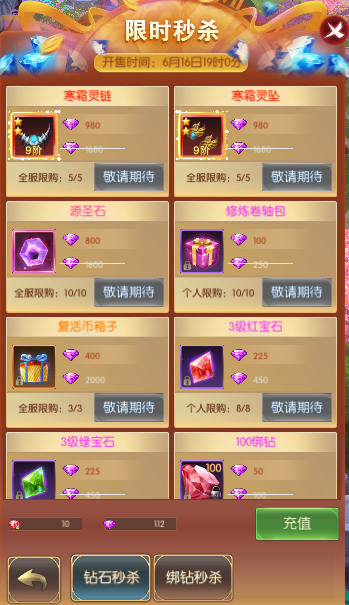 活动简介:活动期间,玩家能以超低的价格秒杀原价道具,机会不容错过。