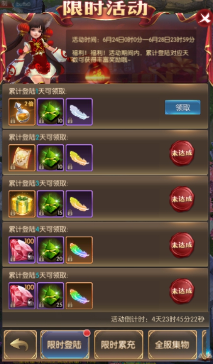 活动简介:福利!福利!活动期间内,累计登陆对应天数可获得丰富奖励哦~