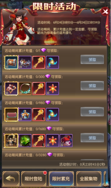 活动简介:活动期间,累计充值达到一定金额,可领取游戏为你准备的返利豪礼