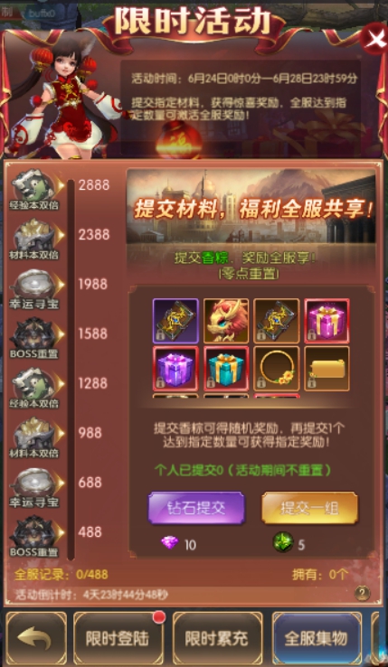 活动简介:提交指定材料,获得惊喜奖励,全服达到指定数量可激活全服奖励!
