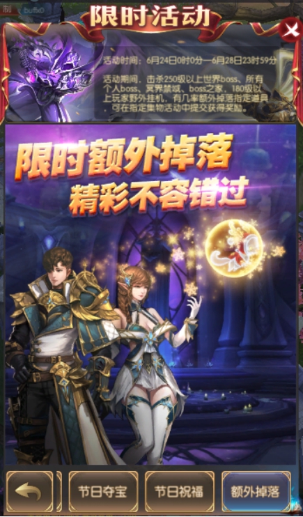 活动简介:活动期间,250级以上的世界boss,所有个人boss额外掉落贪图道具;250级以上世界boss、所有个人boss、冥界禁域、boss之家。180级以上玩家野外挂机有额外掉落指定道具,可在指定全服集物活动中提交获得奖励。