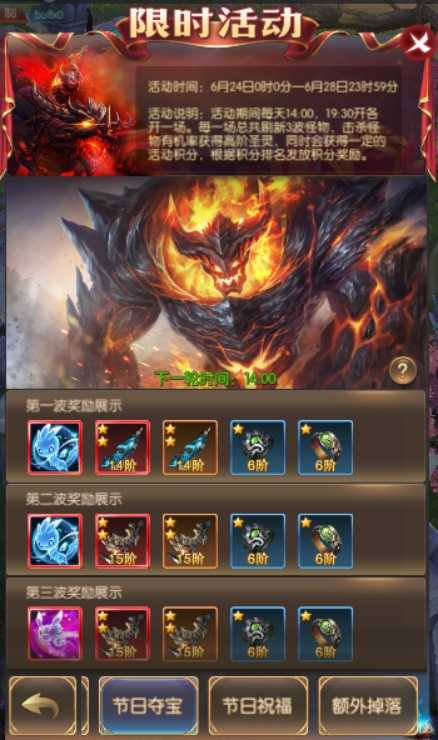 活动简介:活动期间每天14:00,19:30开各开一场。每一场总共刷新3波怪物,击杀怪物有获得高阶圣灵,同时会获得一定的活动积分,根据积分排名发放积分奖励。