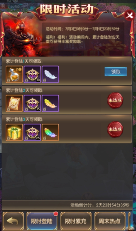 活动简介:福利!福利!活动期间内,累计登陆对应天数可获得丰富奖励哦~