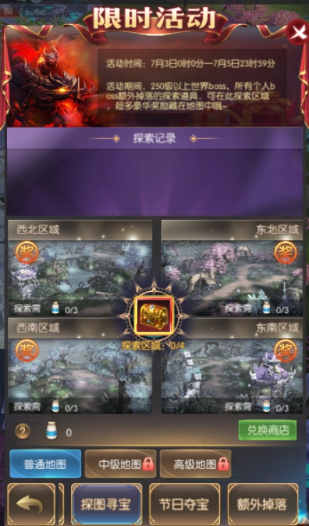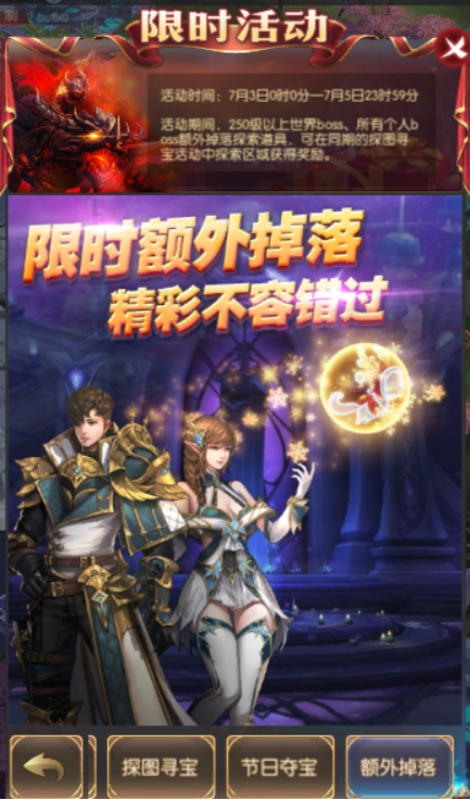 活动简介:活动期间,250级以上世界boss、所有个人boss额外掉落探索道具,可在同期的探图寻宝活动中探索区域获得奖励。