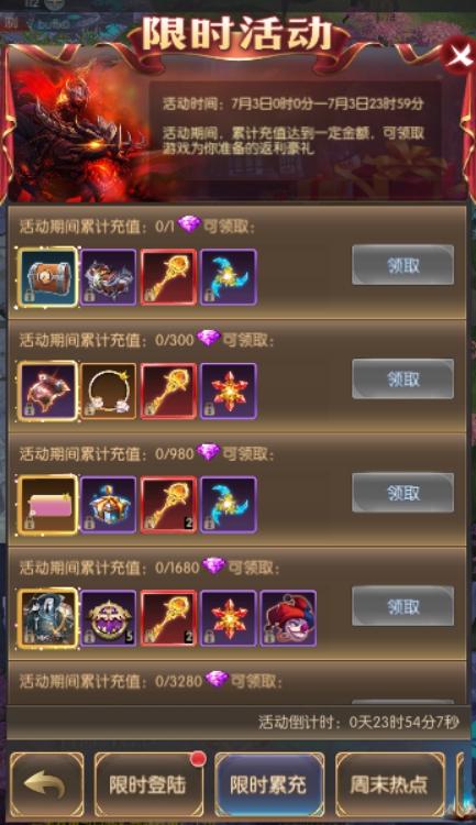 活动简介:活动期间,累计充值达到一定金额,可领取游戏为你准备的返利豪礼