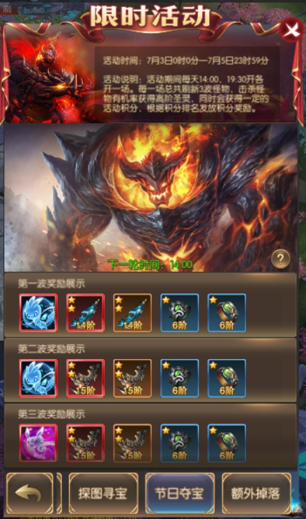 活动简介:活动期间每天14:00,19:30开各开一场。每一场总共刷新3波怪物,击杀怪物有获得高阶圣灵,同时会获得一定的活动积分,根据积分排名发放积分奖励。