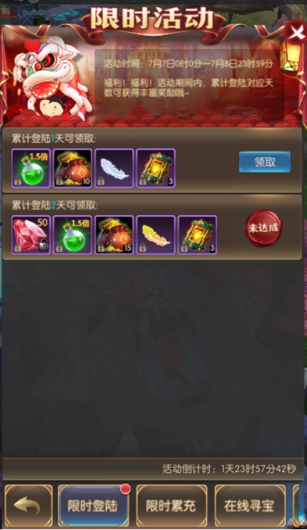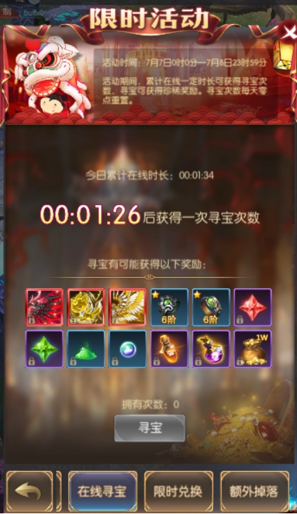 活动简介:活动期间,累计在线一定时常可获得寻宝次数,寻宝可获得珍稀奖励。寻宝次数每天零点重置。