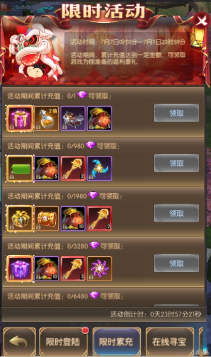 活动简介:活动期间,累计充值达到一定金额,可领取游戏为你准备的返利豪礼