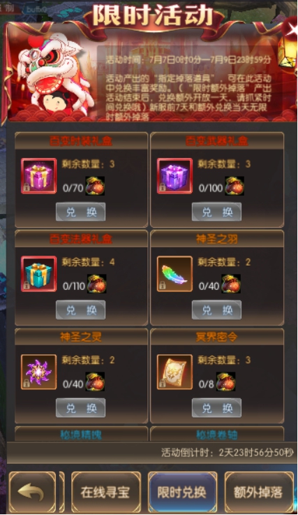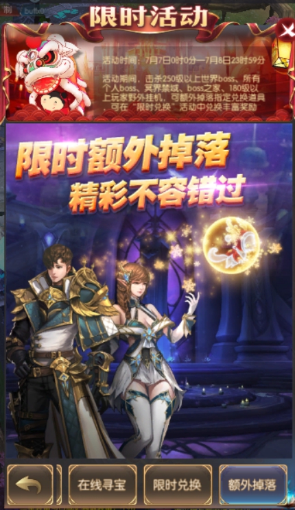 活动简介:活动期间,击杀250级以上世界boss、所有个人boss、冥界禁域、boss之家可额外掉落指定兑换道具,可在“限时兑换”活动中兑换丰富奖励;180级以上玩家野外挂机可额外掉落指定兑换道具,可在“限时兑换”活动中兑换丰富奖励