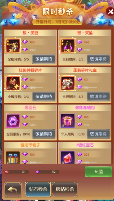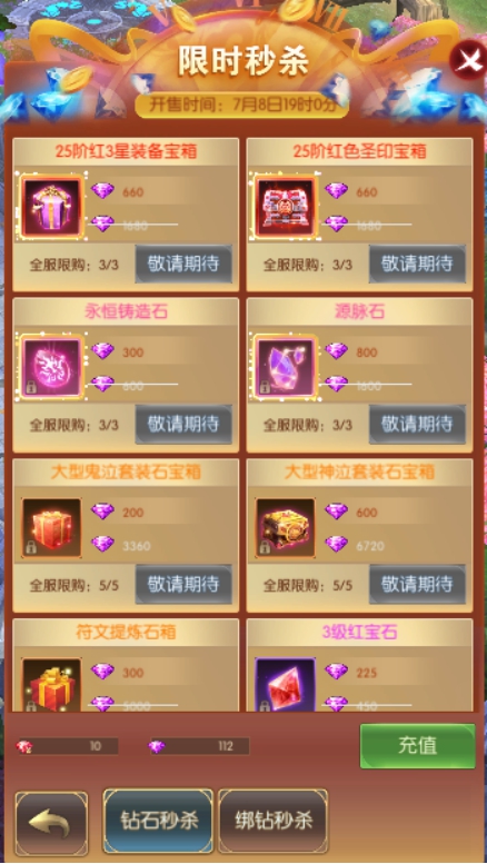 活动简介:活动期间,玩家能以超低的价格秒杀原价道具,机会不容错过。