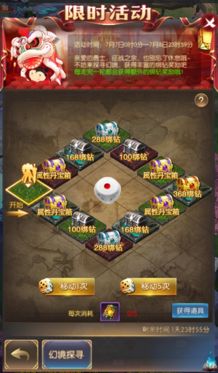 3.投骰子需要消耗幻境探寻道具。幻境探寻道具会通过钻石商城购买、累充和限时兑换获得。