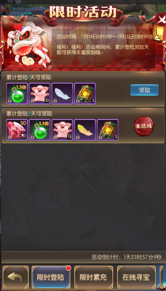 累计登陆1天 | 1.5倍经验药水,猪猪*10,自然之羽,梦幻通行证*3 |