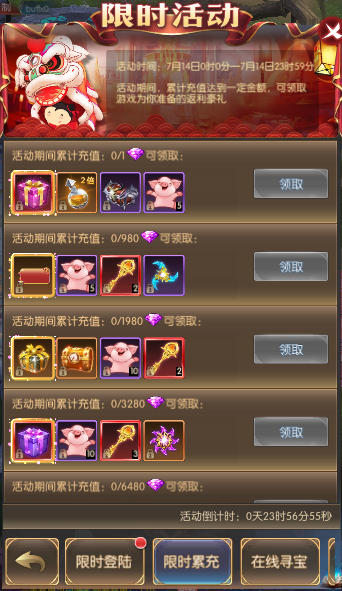 活动简介:活动期间,累计充值达到一定金额,可领取游戏为你准备的返利豪礼