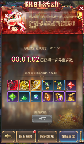 活动简介:活动期间,累计在线一定时常可获得寻宝次数,寻宝可获得珍稀奖励。寻宝次数每天零点重置。