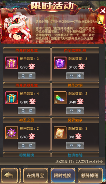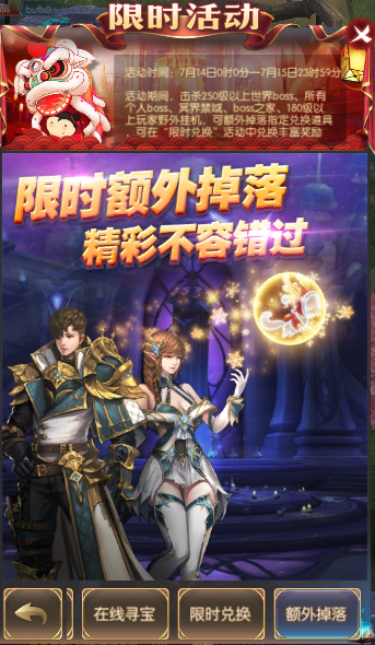 活动简介:活动期间,击杀250级以上世界boss、所有个人boss、冥界禁域、boss之家可额外掉落指定兑换道具,可在“限时兑换”活动中兑换丰富奖励;180级以上玩家野外挂机可额外掉落指定兑换道具,可在“限时兑换”活动中兑换丰富奖励