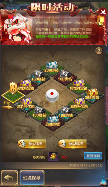 3.投骰子需要消耗幻境探寻道具。幻境探寻道具会通过钻石商城购买、累充和限时兑换获得。