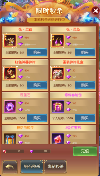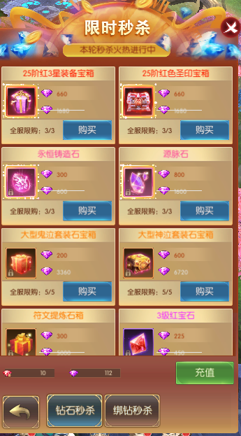 活动简介:活动期间,玩家能以超低的价格秒杀原价道具,机会不容错过。