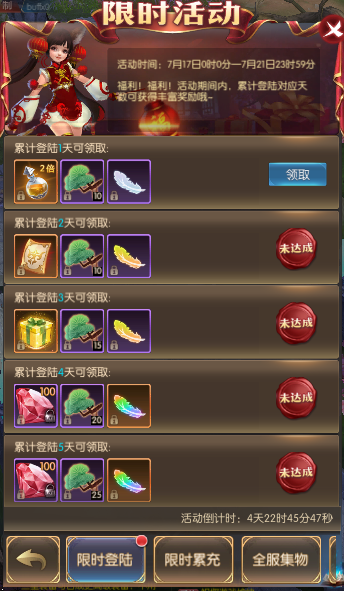 活动简介:福利!福利!活动期间内,累计登陆对应天数可获得丰富奖励哦~