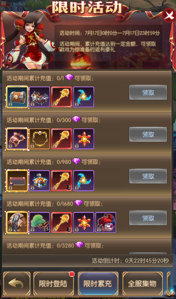 活动简介:活动期间,累计充值达到一定金额,可领取游戏为你准备的返利豪礼