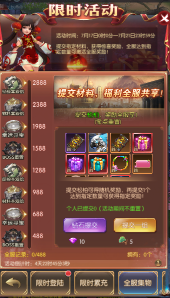 活动简介:提交指定材料,获得惊喜奖励,全服达到指定数量可激活全服奖励!