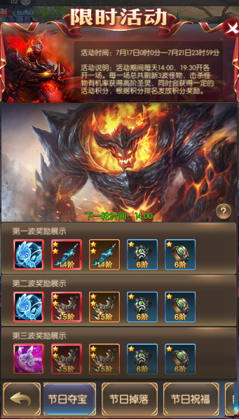 活动简介:活动期间每天14:00,19:30开各开一场。每一场总共刷新3波怪物,击杀怪物有获得高阶圣灵,同时会获得一定的活动积分,根据积分排名发放积分奖励。