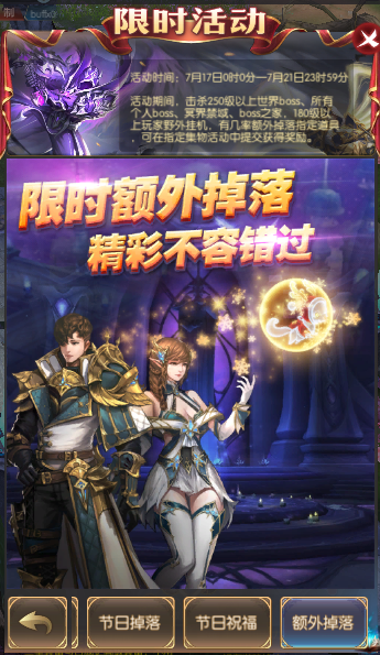 活动简介:活动期间,250级以上的世界boss,所有个人boss额外掉落贪图道具;250级以上世界boss、所有个人boss、冥界禁域、boss之家。180级以上玩家野外挂机有额外掉落指定道具,可在指定全服集物活动中提交获得奖励。