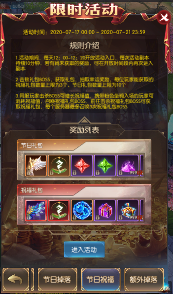 2.击败礼包BOSS,获取礼包,抽取幸运奖励,每位玩家能获取的祝福礼包数量上限为3个、节日礼包数量上限为10个