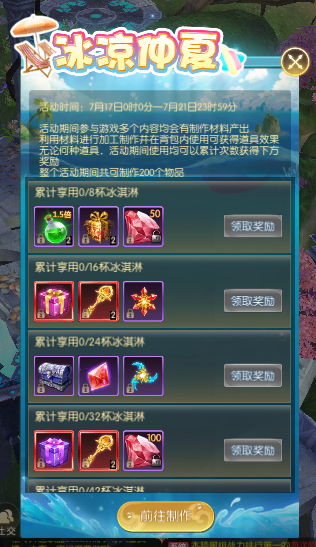 活动简介:活动期间参与游戏多个内容均会有制作材料产出,利用材料进行加工制作并在背包内使用可获得道具效果,无论何种道具,活动期间使用均可以累计次数获得下方奖励