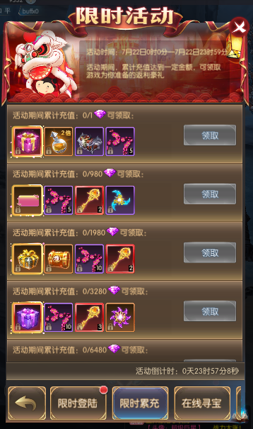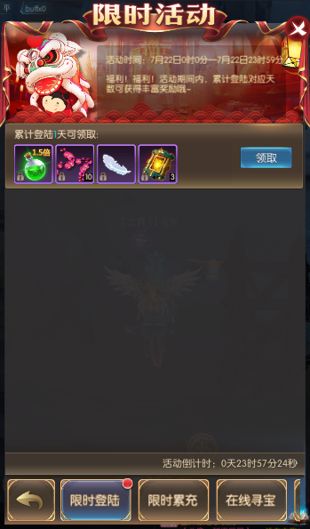 活动简介:活动期间,累计在线一定时常可获得寻宝次数,寻宝可获得珍稀奖励。寻宝次数每天零点重置。