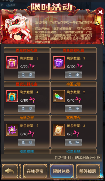 活动简介:活动期间,击杀250级以上世界boss、所有个人boss、冥界禁域、boss之家可额外掉落指定兑换道具,可在“限时兑换”活动中兑换丰富奖励;180级以上玩家野外挂机可额外掉落指定兑换道具,可在“限时兑换”活动中兑换丰富奖励