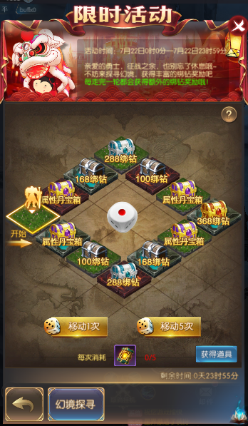 3.投骰子需要消耗幻境探寻道具。幻境探寻道具会通过钻石商城购买、累充和限时兑换获得。
