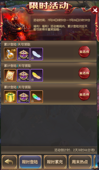 活动简介:福利!福利!活动期间内,累计登陆对应天数可获得丰富奖励哦~