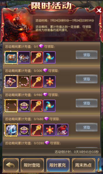 活动简介:活动期间,累计充值达到一定金额,可领取游戏为你准备的返利豪礼