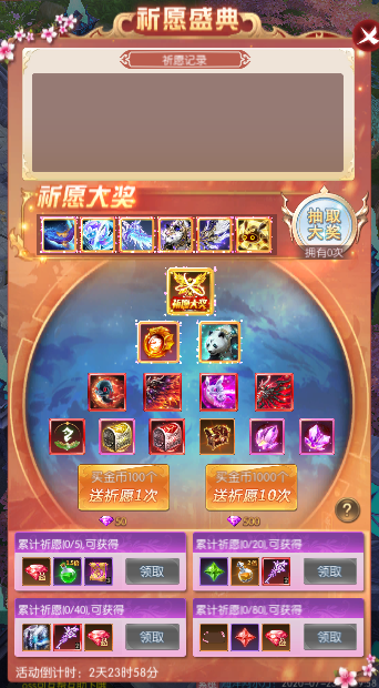 活动简介:活动期间可以消耗钻石购买金币进行祈愿,每次购买会赠送一个祈愿奖励 ;在奖池中抽到祈愿盛典大奖后,可在上方祈愿大奖奖池中抽取一次极品奖励(必然获得奖池中的极品奖励之一) ;祈愿达到累计次数可以获得对应的次数奖励,奖励多多 ;活动期间祈愿累计次数不会重置,活动结束后重置