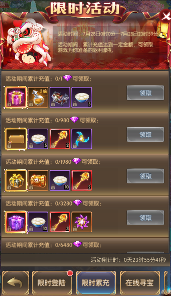 活动简介:活动期间,累计在线一定时常可获得寻宝次数,寻宝可获得珍稀奖励。寻宝次数每天零点重置。