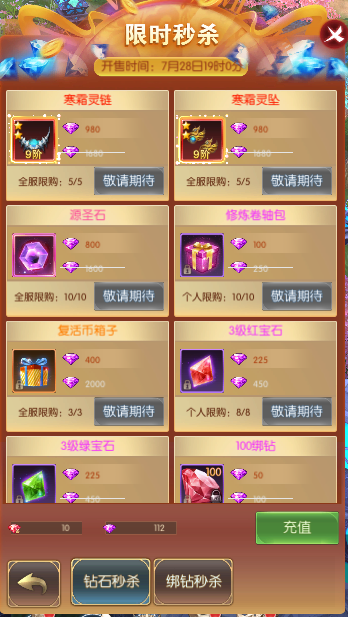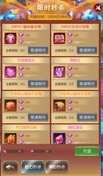 活动简介:活动期间,玩家能以超低的价格秒杀原价道具,机会不容错过。