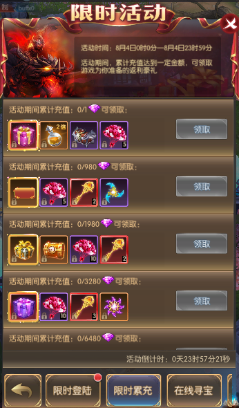 活动简介:活动期间,累计充值达到一定金额,可领取游戏为你准备的返利豪礼